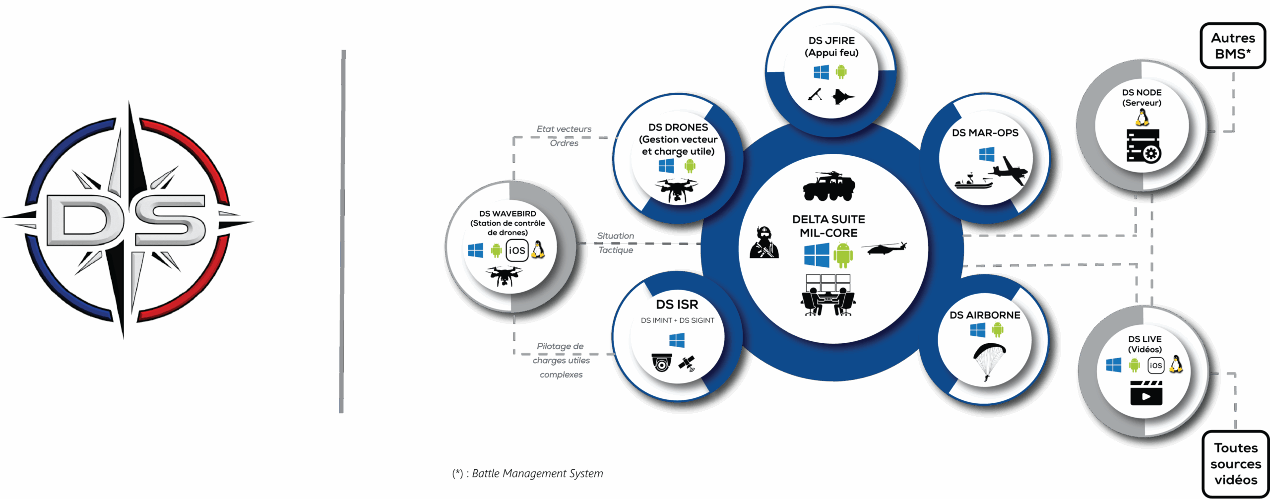 Contrairement à DS WAVEBIRD, qui est dédié quasi exclusivement au télépilotage de drones, le module DS DRONES va permettre de piloter, seul ou associé à d’autres modules (ex : SIGINT), les charges utiles complexes.